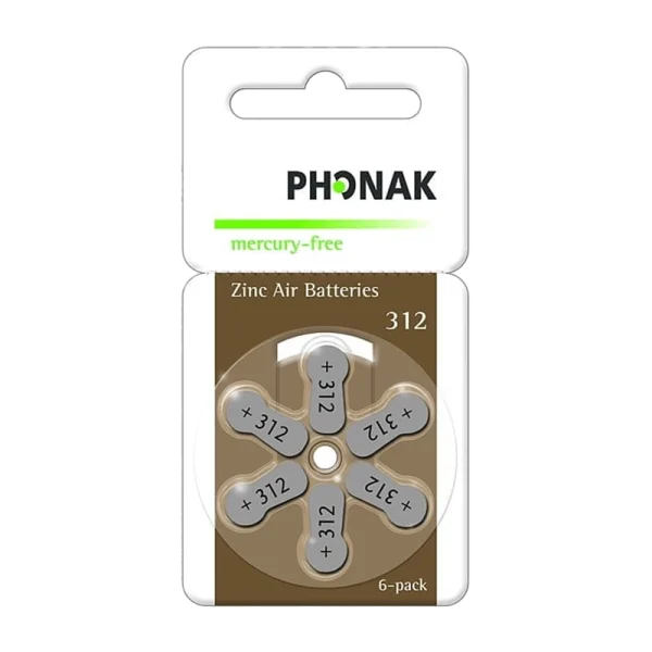 Original Phonak zinc-air battery, size 312. Capacity: 180 mAh. Pack size: 6 batteries. For Phonak hearing aids using size 312 batteries.