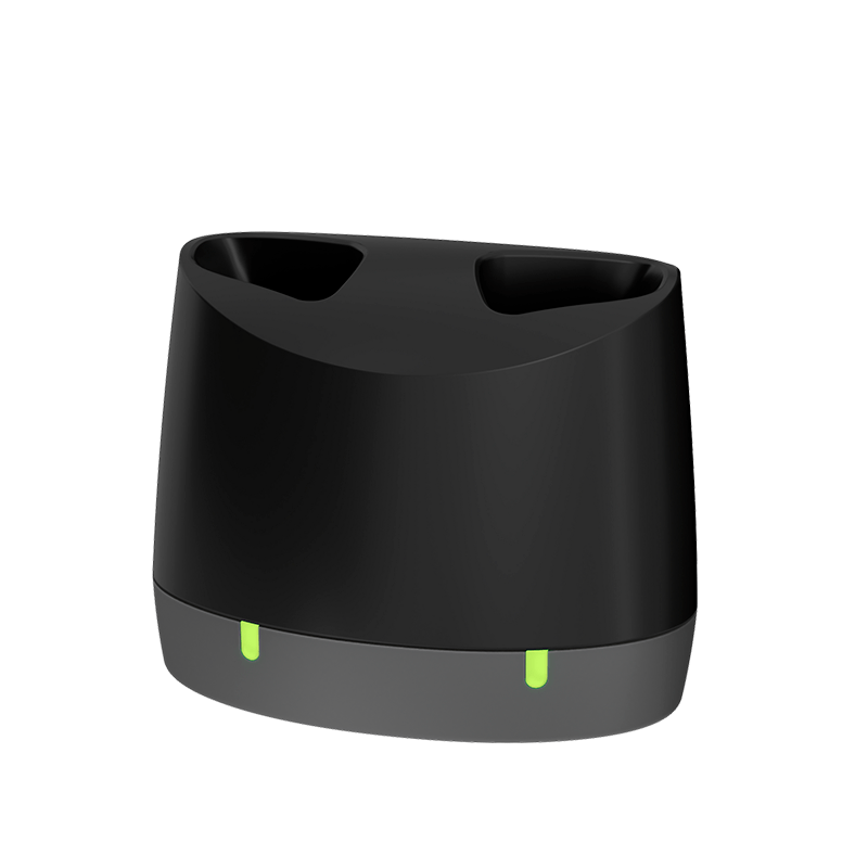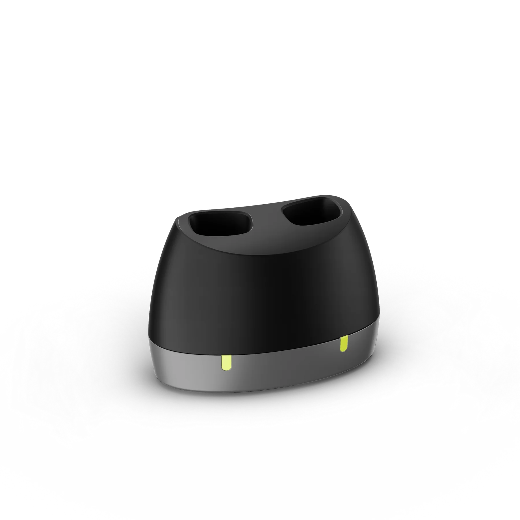 Rexton Charging Station for a range of Rexton hearing aids with lithium-ion batteries. Charging occurs through inductive charging, and the intelligent LED lights indicate the status of the right and left hearing aids.